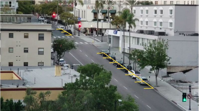 注意那些微小的黄色标记 - 这些是在道路上绘制每个停车位的边界的地方