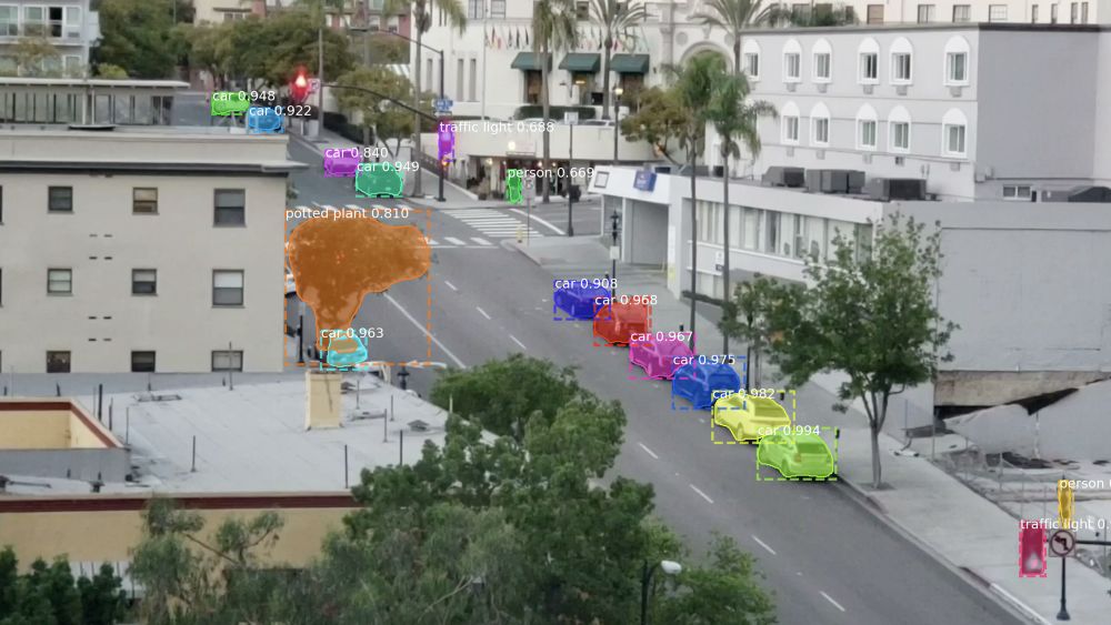 我们不仅检测到了汽车,而且我们也得到交通信号灯和人员等信息。 并且滑稽地,它将其中一棵树确定为“盆栽植物”。