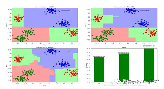 1)从准确率上可以看出,随机森林在这三个测试集上都要优于单棵决策树,90%>85%,82%>80%,95%=95%;