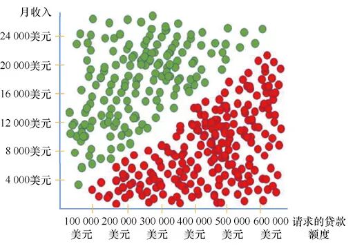 因此,银行基于以往违约者的历史创建了一个数据,如图1.18所示。红点表示银行拒绝受理的申请,绿点表示银行批准的申请。横坐标是请求的贷款额度,纵坐标是月收入。