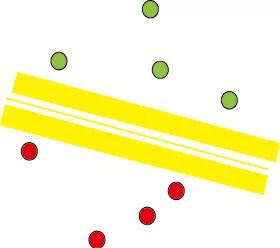 图1.24现在我们要寻找最佳分割路线,而梯度下降并不能解决这个问题,需要线性优化才能实现。这种技术被称为最大间隔分类器或支持向量机(Support Vector Machine, SVM)。