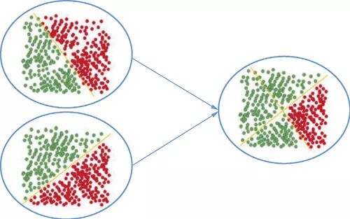 这个概念可以用下面的模型(见图1.22)来理解。在这个模型中,两个神经元通过使用不同的假设建立模型,并且将它们的发现发送给另一个神经元。根据收集到的信息,输出神经元做出决策。