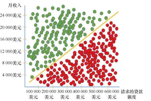 图1.18现在,一个月收入10 000美元的人想要贷款300 000美元,银行是否会给予批准呢?可以通过一条直线来分割数据,如图1.19所示。