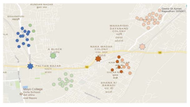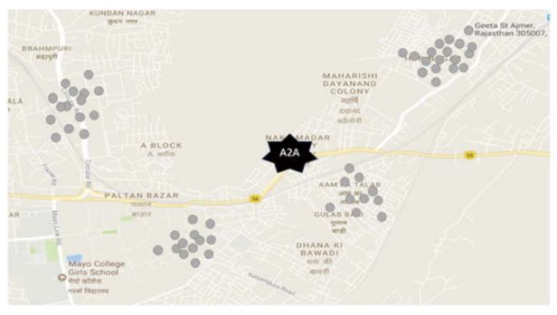 现在来看另一个问题。如图1.27所示,有一家杂货店A2A。他们提供电话送货服务,每当接到电话时,他们就会将地址发送给派送员,派送员会赶赴送货地点并交付商品。他们设法将办公室设在城市的中心,以便为越来越多的人及时提供服务。