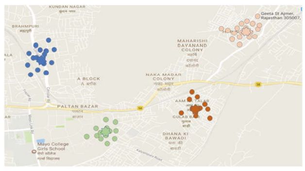 图1.27这里的点代表A2A的服务需求。现在他们意识到,这种一个配送中心处理所有的需求的做法并不明智。于是,他们决定在城市中开设4个配送中心,依照不同地区来接受需求并提供服务。