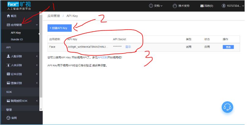 首先,登录Face++官网(若是新用户,先注册一个账号),然后创建应用,获取 key 和 secret。