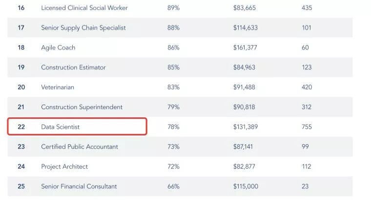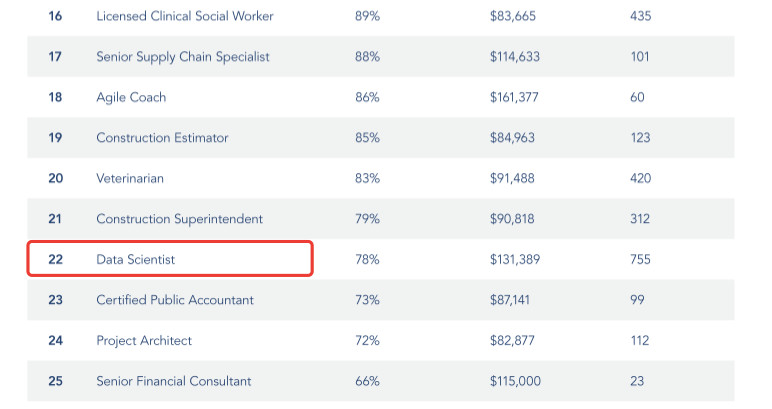 无论如何,数据科学家仍然占据了Indeed2019年最佳工作排行榜中第22名的位置,并且也吸引了其他领域的顶尖人才进入这个行业。