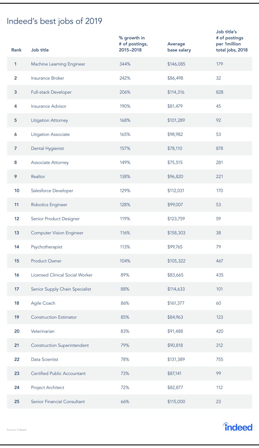 下面就是Indeed的榜单: