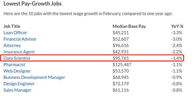 根据Glassdoor的报告,数据科学家(Indeed排名22位)的薪资相比去年的增速在减少。2月份数据科学家的平均工资与去年同期相比下降了1.4%。