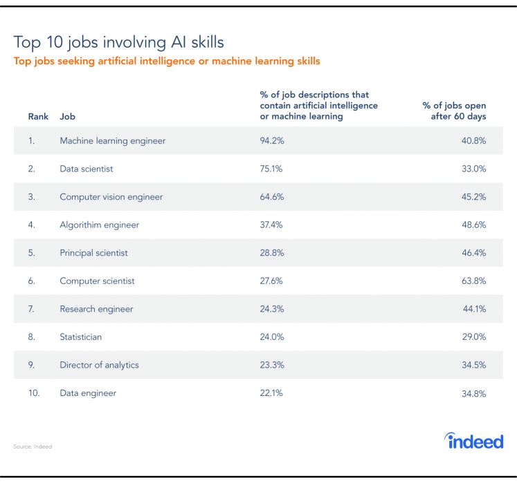 Indeed去年发布另一份榜单“需要AI技能的职位”十大排名: