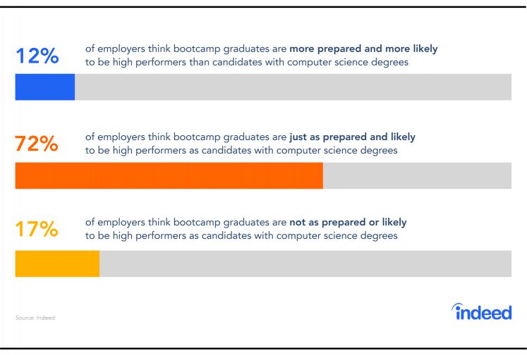 而Indeed的调查也显示,72%的雇主认为非科班出身的毕业生与计算机科学学位的雇员,在实际工作中差距并不明显。