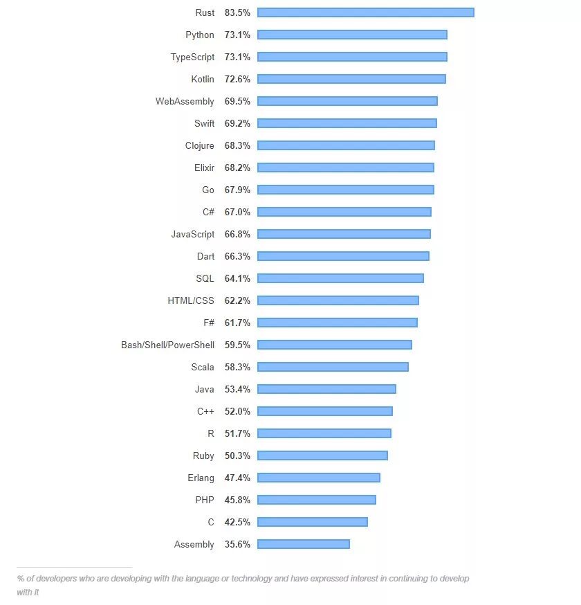 同时在最受欢迎&最想学习的编程语言中,Rust 连续第四年成为受访者中最受欢迎的编程语言,紧随其后的是 Python,位列第二,这是当今发展最快的主要语言。 这意味着,按比例,更多开发人员希望继续使用这些语言。