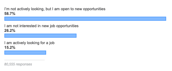15%的受访者正在积极寻找工作,但近60%的开发人员有兴趣了解新的就业机会。