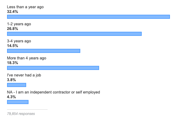 超过一半受访者表示距上一次换工作在两年之内:软件开发者换工作是常态。