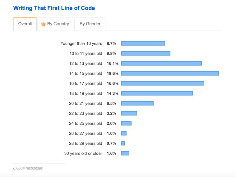 超过一半的受访者在十六岁时编写了第一行代码,但这种情况因国家和性别而异。