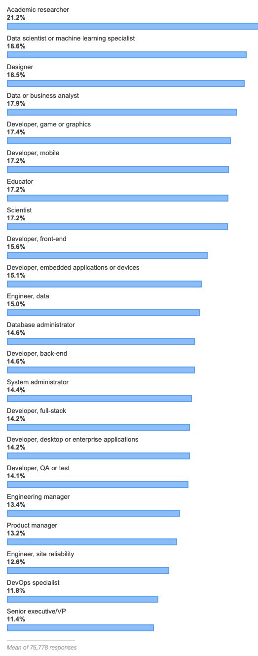 在专业开发人员中,那些担任高级工程主管、DevOps 专家和 SRE 的人找工作的积极性最低。在学术界和数据科学家工作的开发人员正在找工作的占比最高。