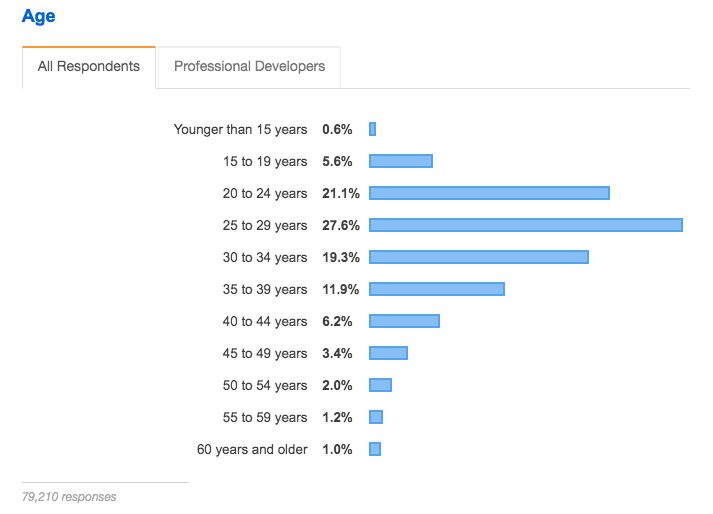 调查结果显示,75% 的专业开发者年龄小于 35 岁。受调查者的工作年限不一,报告显示 5~10 年的开发者占比最重,达三成之多。5 年以下和 10~14 年的开发者分别次之,占比为 20.5% 和 19.0%。整体来看,近一半的受访者表示自己的开发经验少于 10 年。