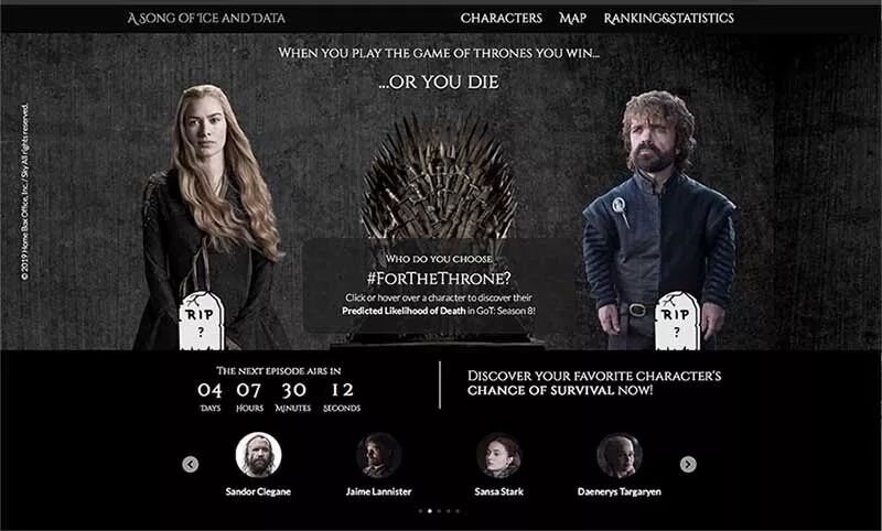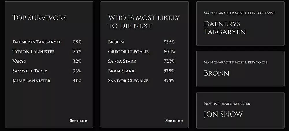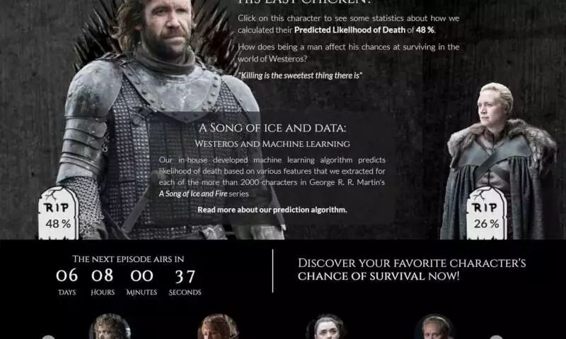 慕尼黑工业大学的学生们创建了一种机器学习算法,用来分析《权游》原著小说《冰与火之歌》中的角色数据,并试图找出当中预示着角色死亡的标记。为此,他们爬取了冰与火之歌维基、Fandom Game of Thrones Wiki 等网站的公用信息,使用JavaScript编写机器学习算法来预测权游角色的死亡率。