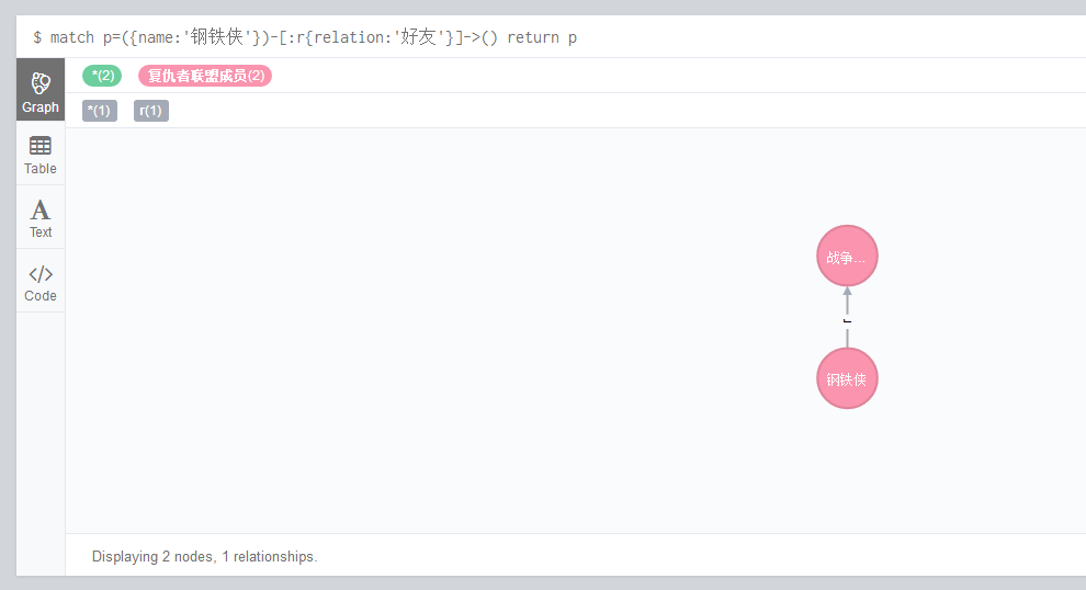 match p=({name:'钢铁侠'})-[*..2]->()return p
