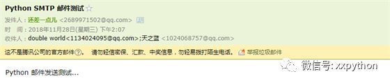 def send_email(receivers, title, text):    message = MIMEText(text, 'plain', 'utf-8')    message['From'] = formataddr(["就差一点儿", sender])      message['To'] = Header(','.join(receivers), 'utf-8')