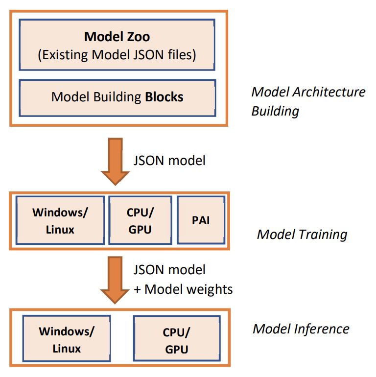 • 模型构建:用户只需要配置简单的 JSON 文件,就能够构建模型和调整参数,大大减少了模型实现的工作量;