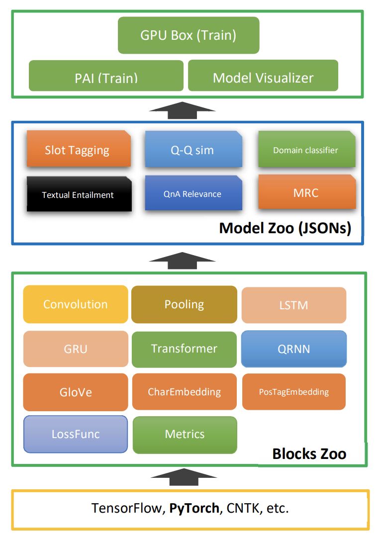 提供大量预构建好的深度神经网络模型,涵盖了常见的 NLP 任务。这些模型以 JSON 配置文件的形式呈现,用户可以通过简单修改 Model Zoo 中的示例模型配置,即可将其应用于自己的任务中。此外,工具包支持 Linux 和 Windows 操作系统、CPU 与 GPU 处理器、以及 PAI 等 GPU 调度平台。