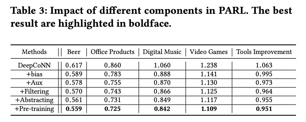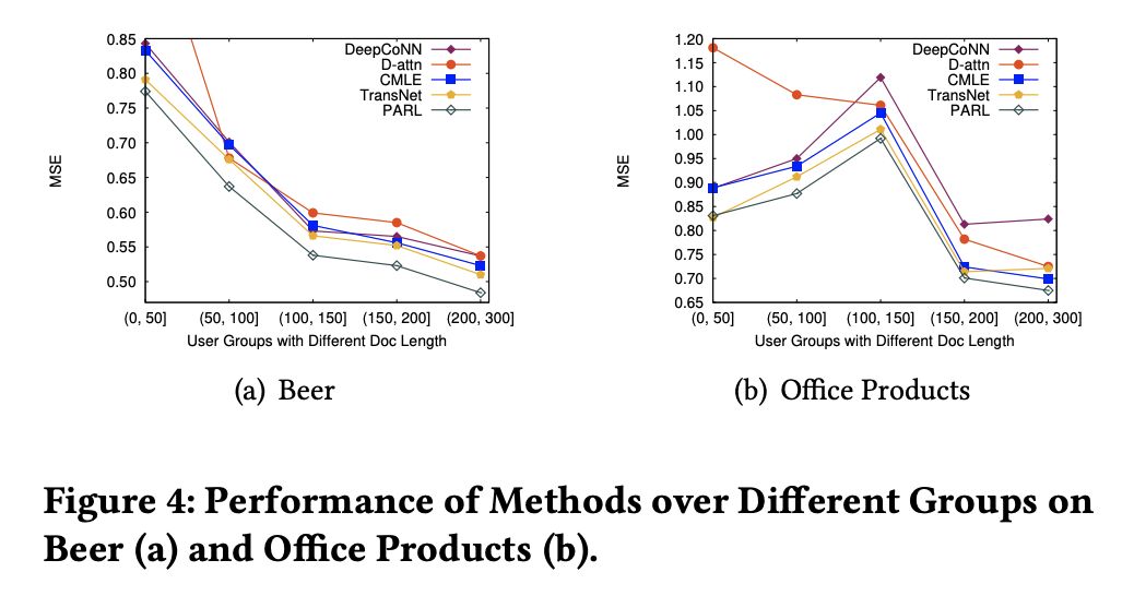 另外,为了验证 PARL 是否能通过利用辅助文档改善基于评论的推荐系统在评论数据稀疏时的表现。作者根据用户评论文档的长度把用户划分为 5 组。我们可以发现在 Beer 和 Office Products 数据集的大多数分组上,PARL 都能达到最低的预测误差。因此说明 PARL 可以通过利用辅助评论文档更好地提高分数预测的精确度。另外随着文档长度越长,PARL 带来的效果提升也更明显。