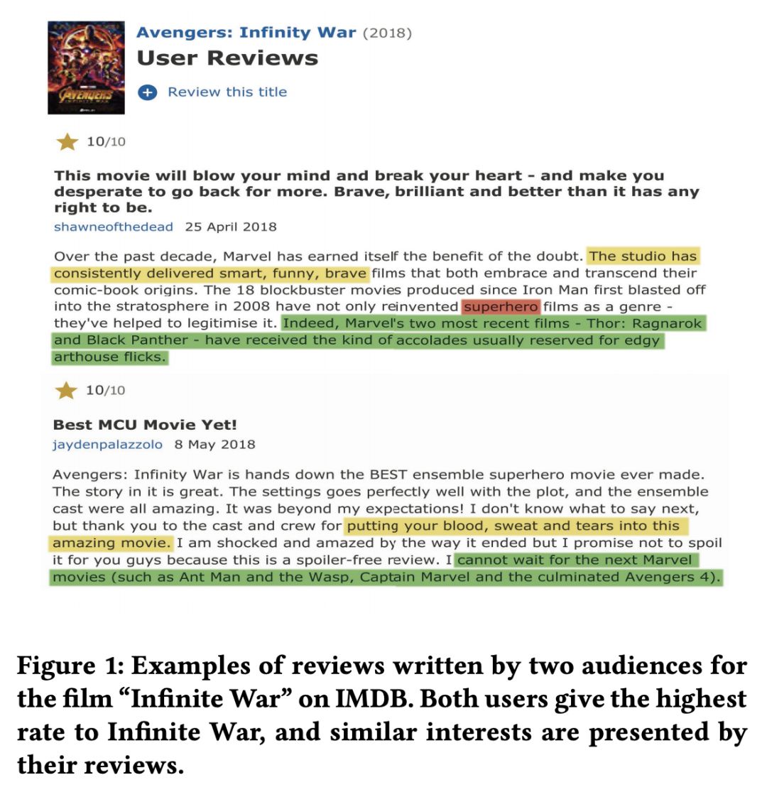 从图 1 可以看出,两位 IMDB 的用户“Shawn”和“Jayden”均对“复仇者联盟 3”给出了十分的满分。虽然他们在真实世界里可能互为陌生人,但他们对“复仇者联盟 3”所给出的评价均有利于我们对另一个用户做出更好的画像(例如:根据 Jayden 的评论,我们可以合理推测 Shawn 也会喜欢“蚁人”这部电影)。