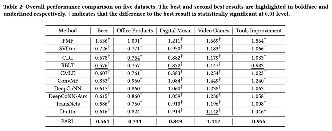 本文在五个数据集上做了实验来验证模型的有效性。同时为了验证 PARL 是否能有效改善基于评论的推荐系统在评论数据稀疏时对分数的预测精度,本文把用户文档根据长度划分成不同的用户群并分别进行了分数预测的实验。最后,本文通过一个可视化实验来说明 PARL 具有从辅助文档中提取有效语义特征的能力。