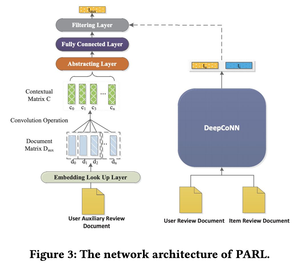 本文提出一个基于深度学习技术的推荐模型 PARL。PARL 可以通过从同好用户所写的辅助评论中提取有效的语义特征来优化基于评论的深度推荐模型在分数预测任务上的性能。PARL 也是第一个尝试解决文本稀疏性的推荐工作。