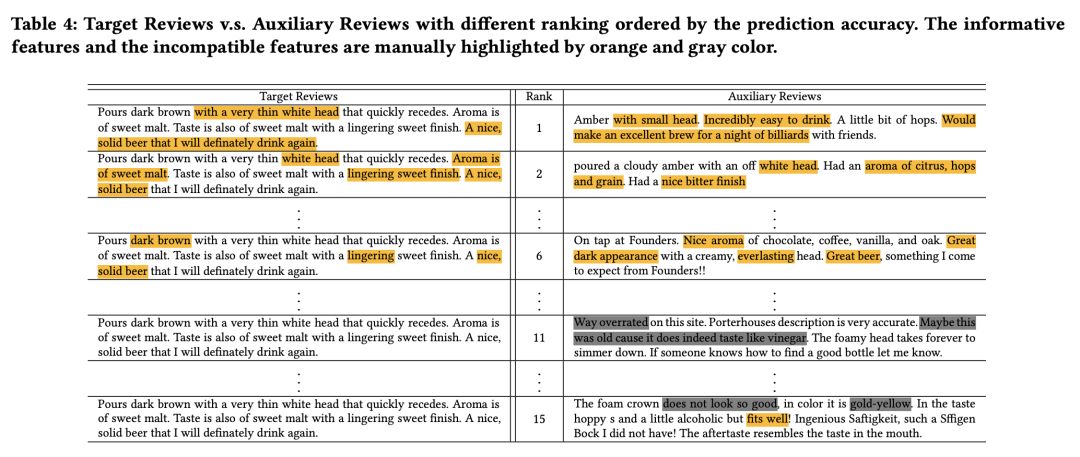表 4 展示了辅助文档中和目标评论相关联的语义特征之间的可视化。可以看出,当辅助文档与当前目标的评论在语义上关联度越大,他对分数预测的精确度就会越好(排名就会越高)。也在一定程度上展示了 PARL 模型具有有效地提取用户-商品对相关的语义特征的能力。