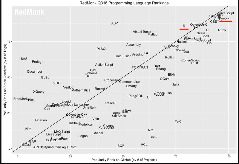 上图显示的是Red Monk在2018年第三季度的调查结果。这些结果是基于Stack Overflow和Github上流行的语言得出的,并清楚地表明R和Python的评分都很高。因此,我们没有内在的理由不能在同一个项目上与他们一起工作。我们的最终目标应该是做更好的分析,得出更好的见解,选择一种编程语言不应该成为实现这一目标的障碍。