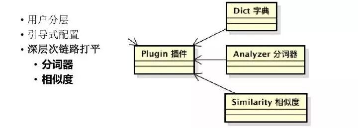 什么叫深层次结构打平?就是指像现在的分词器,相似度这些都是在 index 级别下的,我们将其抽象出来,变为全局的。用户可以自行创建全局的分词器、相似度,并且还可以共享给其他人,就像一个资源一样。然后在 index 中则是引用这个分词器。