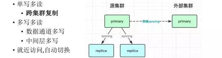 容灾时进行主备互换,然后恢复后再补上在途数据。由上层来保证单写,多读和容灾切换逻辑。