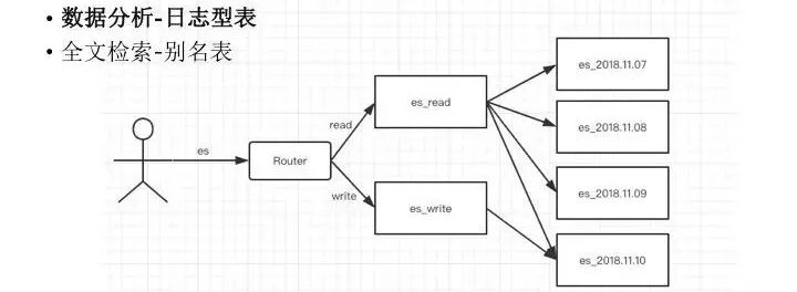 比如我们现在有个业务场景,有张es的日志表,只想保留3天,于是我们就给他按天创建索引,然后写入索引挂载到今天,查询索引挂载所有的,用 router 去自动改写别名,用户还是传入 es,但是执行写入操作时实际就是在 es_write 执行,查询就是在 es_read 执行。