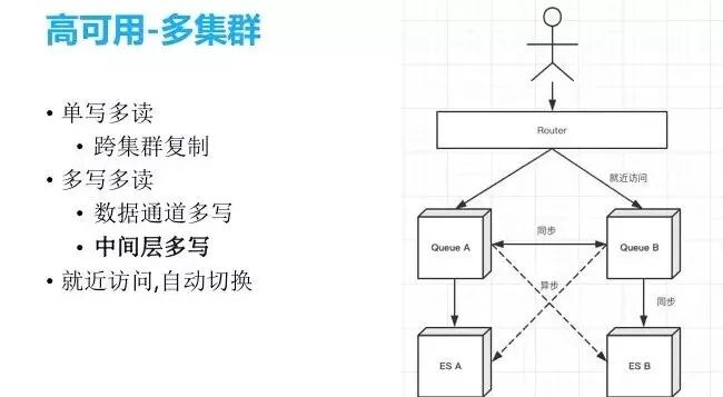 正如我之前提到那样,ES 本身其实提供了跨机房部署的方案,通过打标就可以进行跨机房部署,然后通过preference可以保证业务就近查询。我这里就不再详细说了。