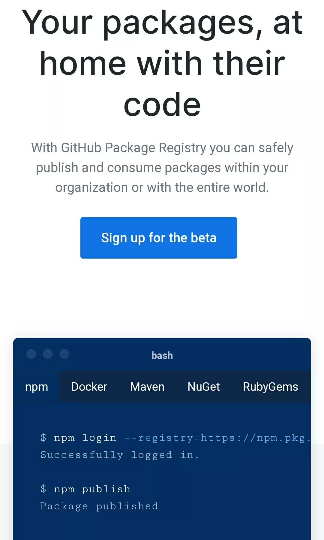 GitHub 发大招了,推出软件包管理服务,第一期支持五种模块:npm、gem、maven、docker、nuget,当然还有私有库。