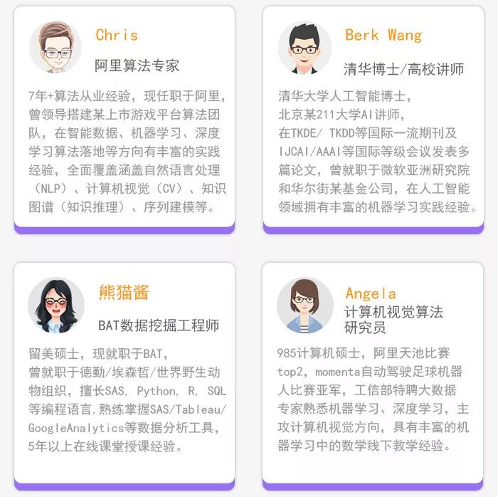 为了能具体解决初学者人工智能入门难的问题,我特地邀请了三位人工智能领域的专家,包括一位清华AI博士@Beck Wang,一位计算机视觉方向的专家@Angela,一位百度的数据挖掘工程师@熊猫酱,以具体工作流为核心,针对学习者各个机器学习核心能力进行培养,举办了一个为期8天的人工智能训练营。
