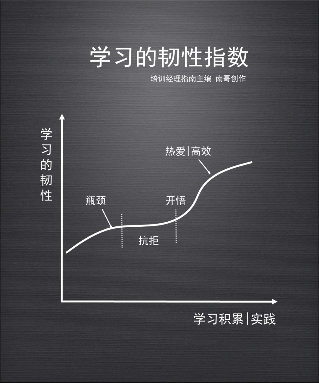而学习韧性的经历需要突破学习的瓶颈区,只有你在某个领域中获得了足够的积累,能够突破从瓶颈到开悟的抗拒区域,你才能真正地领悟到学习的魅力,否则你是很容易陷入到刷朋友圈及打王者荣耀的短暂娱乐中,而被奶嘴安抚,远离了知识。