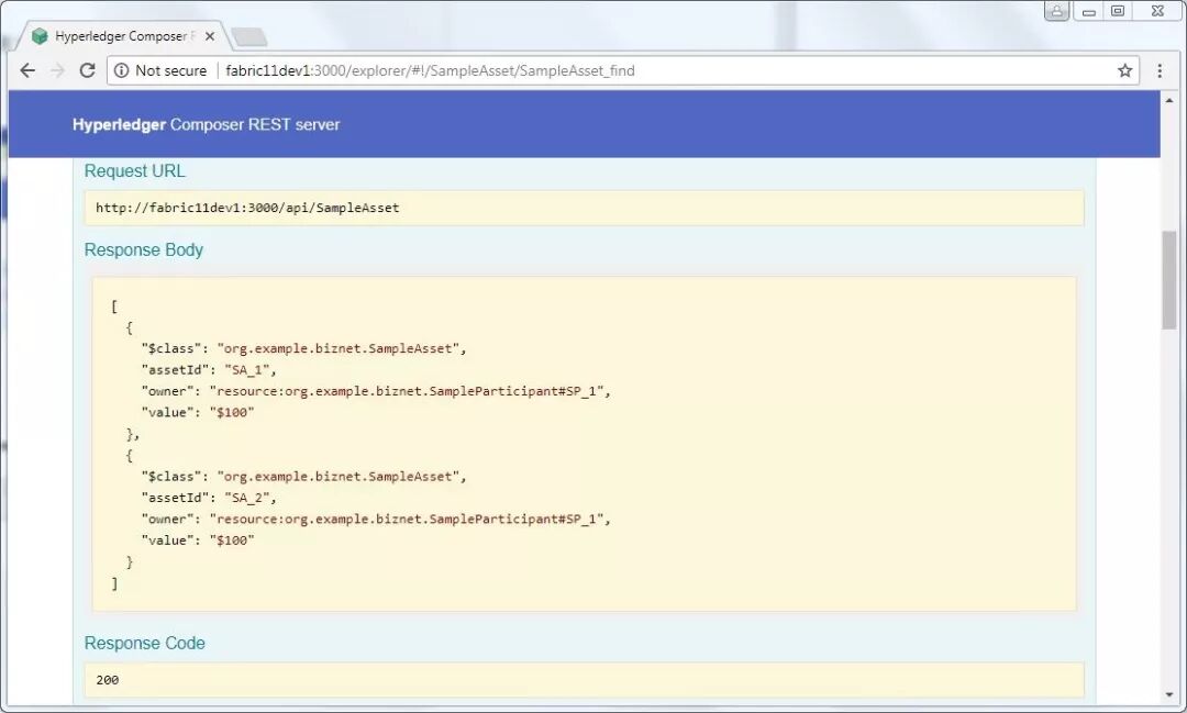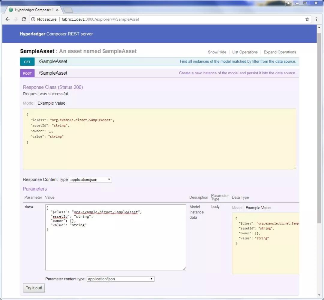 点击 Try it out! 按钮,REST Service 会向这个区块链业务网络添加新的 SampleAsset。如果添加成功,会在界面下方显示 "Response Code 200" 类似的输出内容。