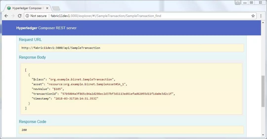 "org.example.biznet.SampleTransaction" 是将要提交的交易模型名称;"org.example.biznet. SampleTransaction#SA_1" 是之前添加的 SampleAsset 实例的引用;newValue"$105" 是指将这个 SampleAsset 实例中的 value 改成新的值 "$105"。