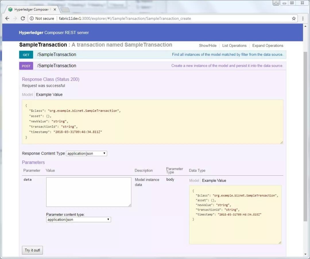 点击 Try it out! 按钮,REST Service 会向这个区块链业务网络提交这个交易。如果提交成功,会在界面下方显示 "Response Code 200" 类似的输出内容。