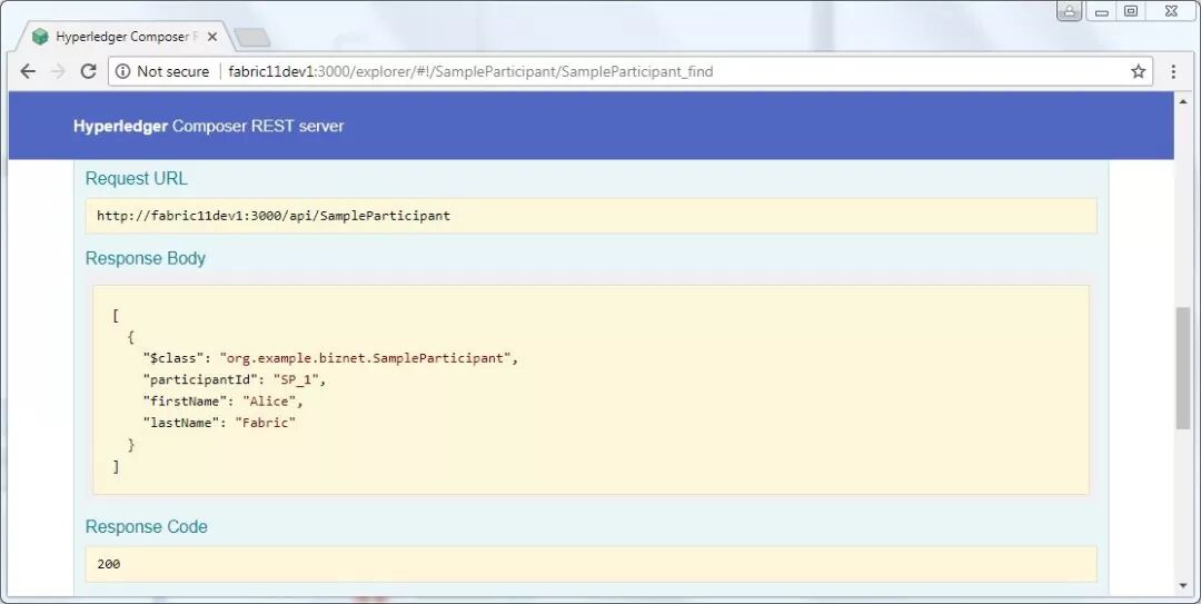 点击 Try it out! 按钮,REST Service 会向这个区块链业务网络添加新的 SampleParticipant。如果添加成功,会在界面下方显示 "Response Code 200" 类似的输出内容。