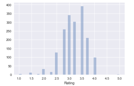 给出不同rating列的数量并绘制。 条形图彼此相邻显示,因为被测量的变量是连续的并且在x轴上。 这个图背后的故事是什么? 我们可以看到约390人为巧克力提供3.5评级。