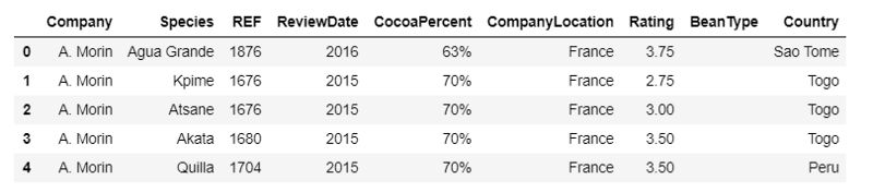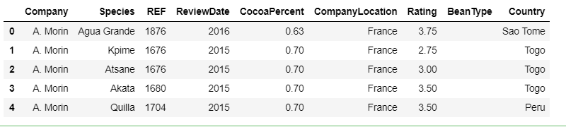 original_col = chocolate_data.columnsnew_col = ['Company', 'Species', 'REF', 'ReviewDate', 'CocoaPercent','CompanyLocation', 'Rating', 'BeanType', 'Country']chocolate_data =chocolate_data.rename(columns=dict(zip(original_col, new_col)))chocolate_data.head()