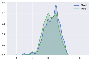 Blended = chocolate_data.loc[chocolate_data.BlendNotBlend == 1]NotBlended = chocolate_data.loc[chocolate_data.BlendNotBlend == 0]ax = sns.kdeplot(Blended.Rating, shade=True,shade_lowest=False, label = "Blend")ax = sns.kdeplot(NotBlended.Rating, shade=True,shade_lowest=False, label = "Pure")