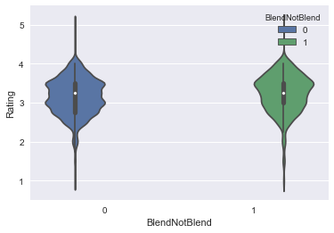 ax = sns.violinplot(x=”BlendNotBlend”, y=”Rating”, data=chocolate_data, hue=”BlendNotBlend”)
