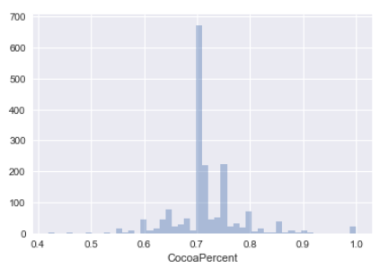 下一个连续变量是CocoaPercent。 很多人喜欢黑巧克力(我不是),所以我们希望看到巧克力中包含的黑暗分布。
