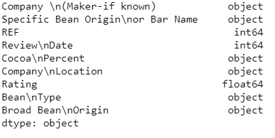 #Lets have a look at the data and see identify Object/Categorical values and Continuous valueschocolate_data.dtypes