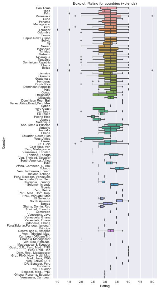 # Look at boxplot over the countries, even Blendsfig, ax = plt.subplots(figsize=[6, 16])sns.boxplot( data=chocolate_data, y='Country', x='Rating')ax.set_title('Boxplot, Rating for countries (+blends)')
